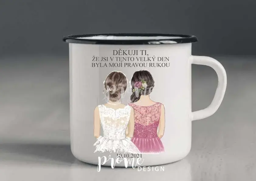 Plechový hrneček obrázkem nevěsty a družičky či svědkyně a Vaším vlastním textem.