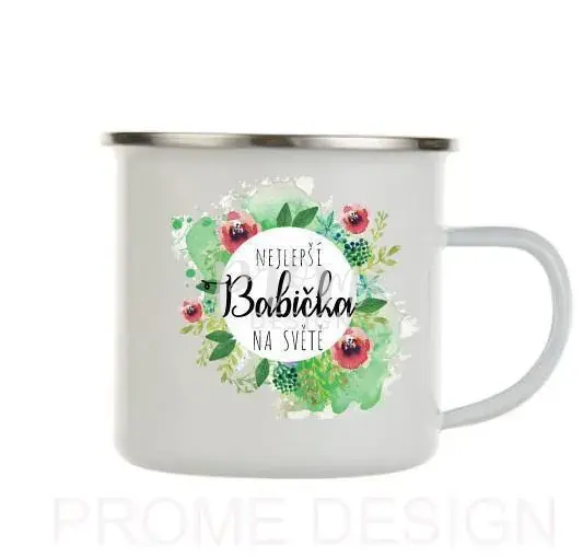 Plechový hrneček s nápisem "nejlepší babička na světě" se skvěle hodí na ranní kávu/čaj nebo výlet do přírody.