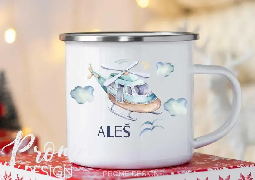 Stylový a originální plechový hrnek s velmi krásným a decentním obrázkem vrtulníku a jménem či textem dle Vašeho přání.
