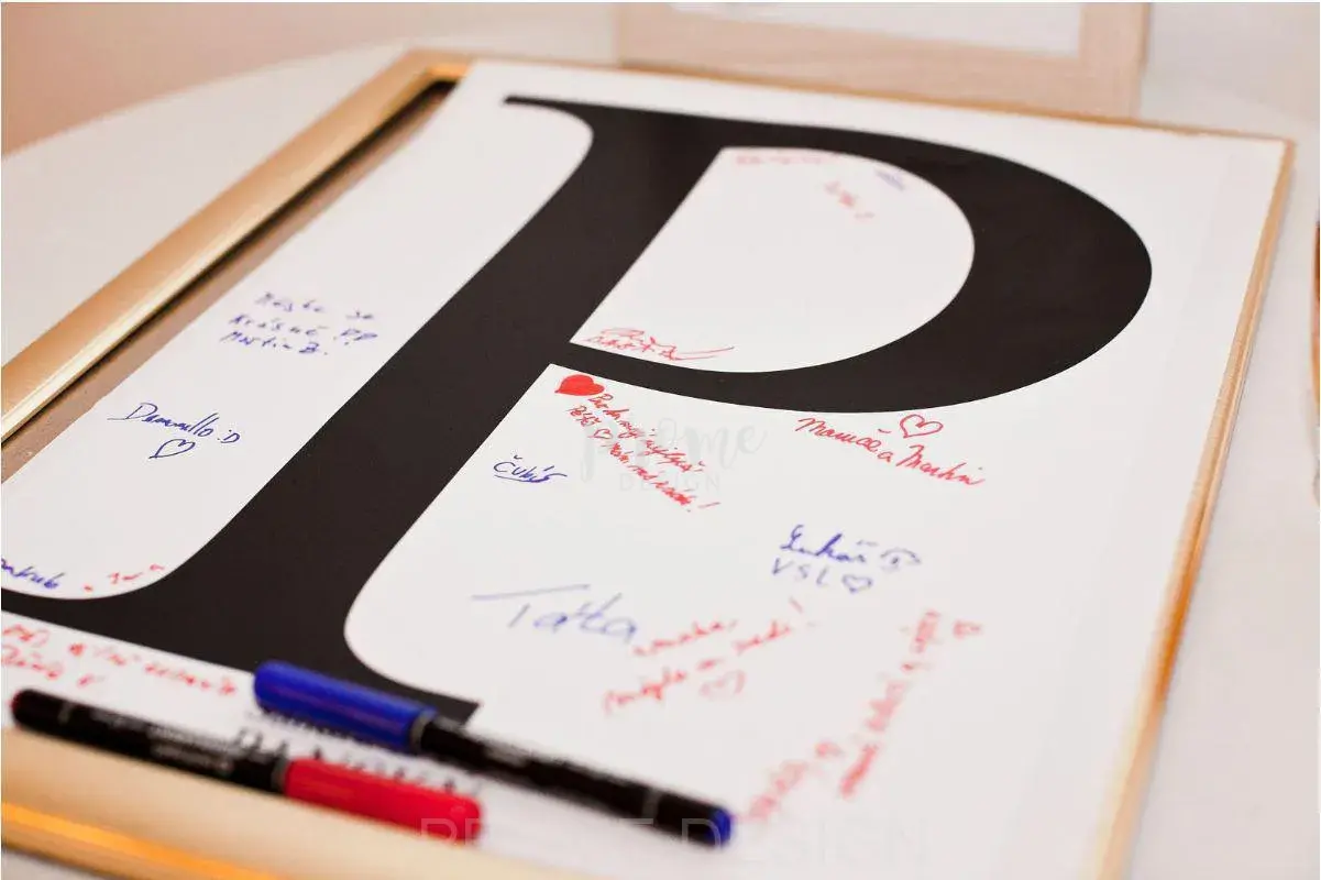 My Vám přinášíme tento originální plakát s písmenem novomanželů či iniciály , který upravíme do barvy Vaší svatby. Každý z hostů tak vepsat své jména a například věnování, nějakou tu radu do manželství či jen podpis.