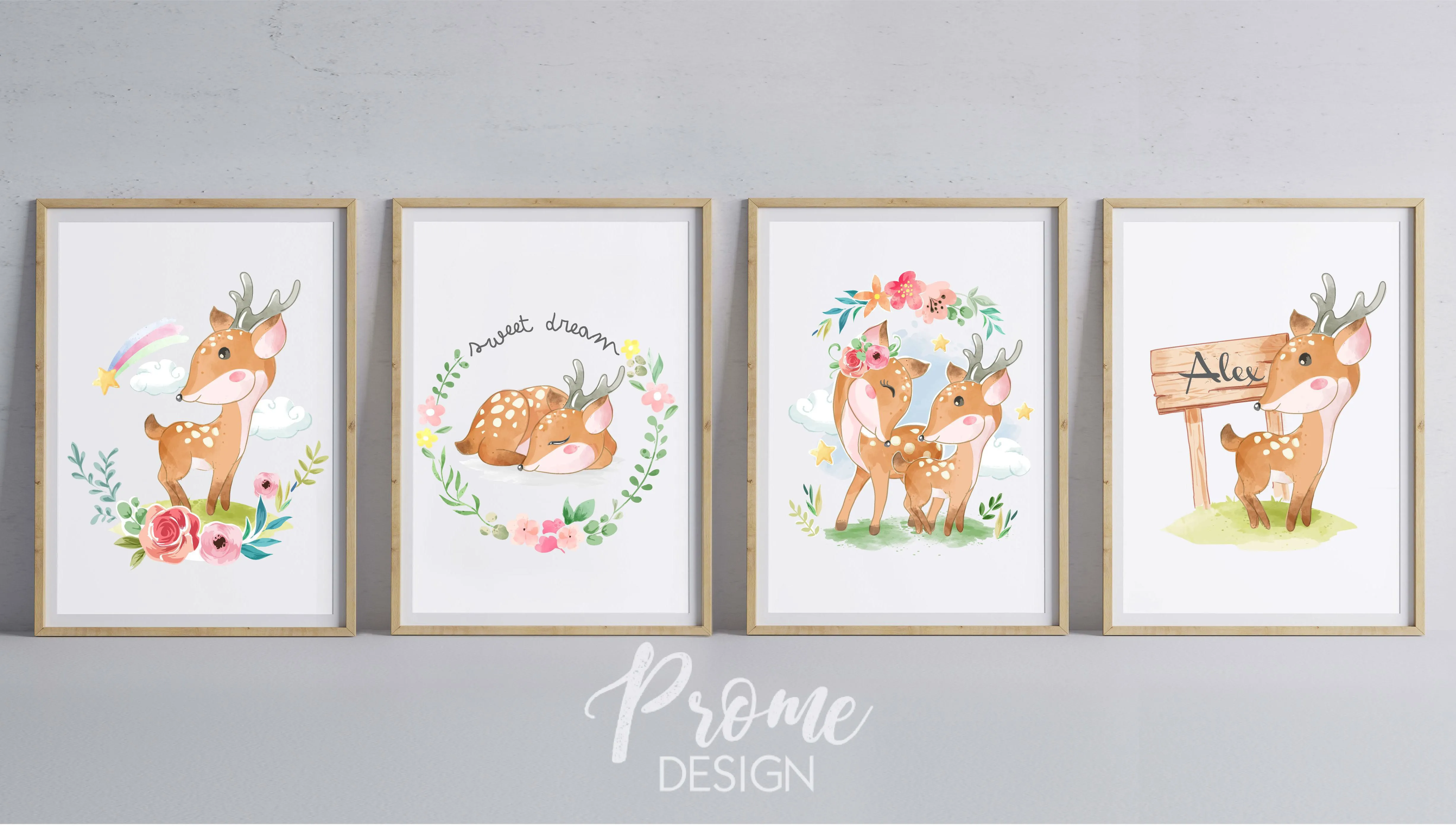 Tyto úžasné čtyři plakáty budou nejlépe vypadat zavěšené dohramy dodají tak pokojíčku unikátní design. Plakát jelínka s dřevěnou cedulí navíc upravíme na míru jméno dle přání.