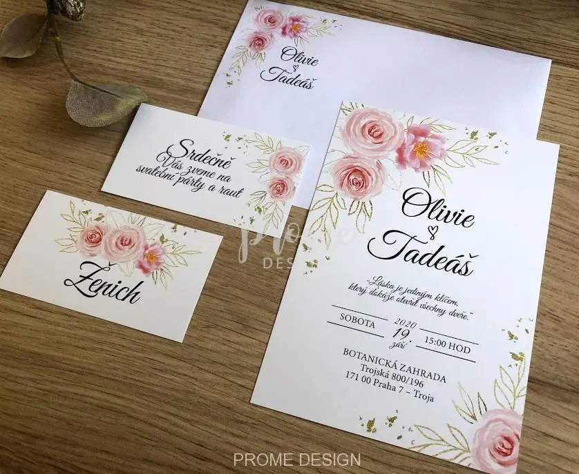 Svatební oznámení udává styl celé svatby. Svatební oznámení s motivem pivoněk v růžových a tónech s lístky ve zlaté barvě je nadčasové.