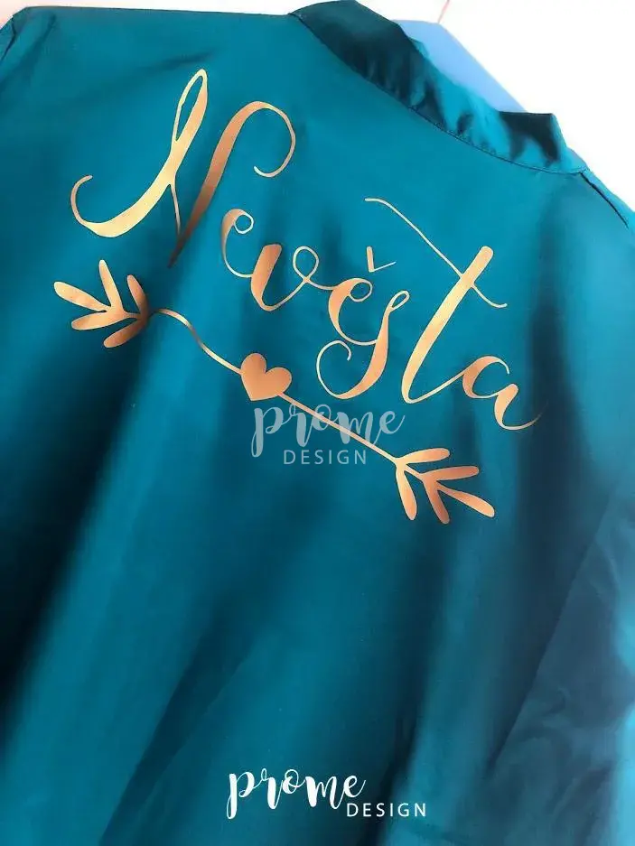 Hledáte originální dárek pro nevěstu, družičku, či svědkyni? Nebo toužíte po dokonalosti a dokonalém vzhledu v den svého "D"? Přinášíme vám nádherný dámský svatební župan/kimono s vlastním nápisem. Navíc, díky možnosti úpravy textu, je vhodný nejen pro nevěstu, ale také pro družičku, maminku nevěsty či svědkyni. Krásná smaragdově zelená barva tohoto županu je dalším lákadlem.