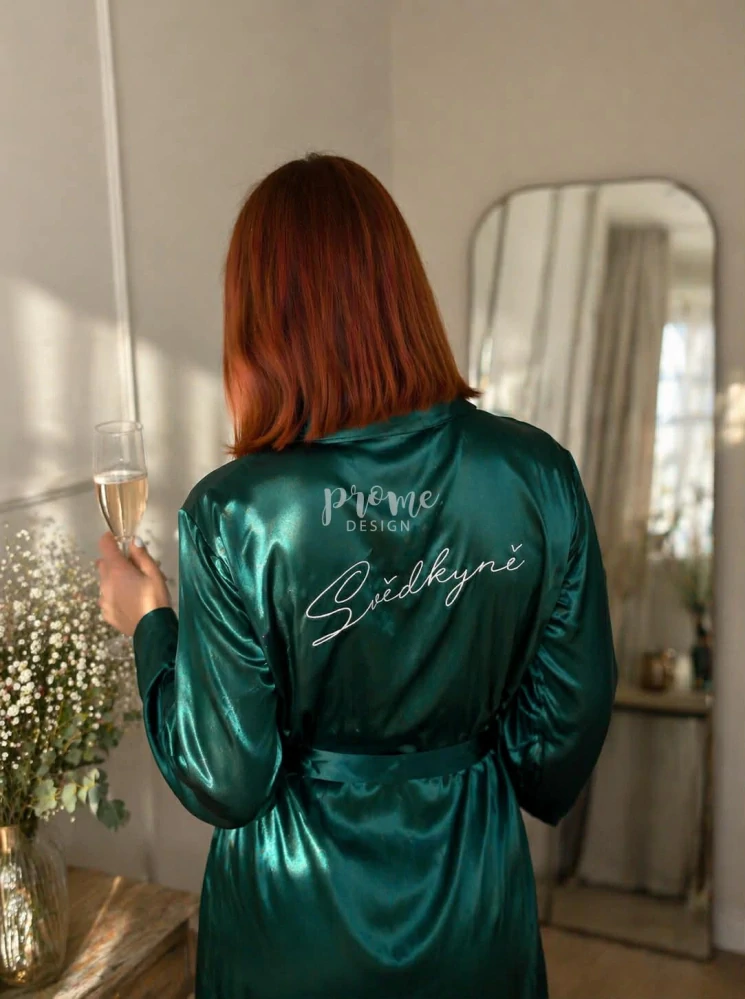 Hledáte originální svatební župan pro nevěstu, družičku nebo svědkyni, který dodá vašemu dni elegantní a luxusní vzhled? Tento dámský svatební župan ve smaragdově zelené barvě je ideální volbou na svatební přípravy, focení i jako stylový dárek.