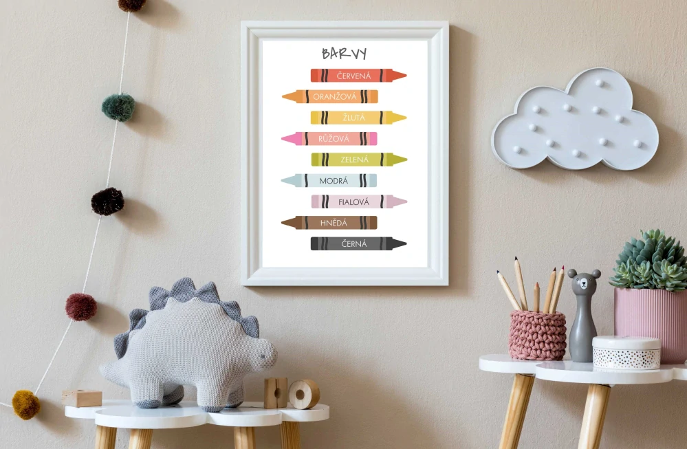- Stimulace smyslů: Barvy mají pozitivní vliv na psychický stav člověka. Při pohledu na barevné plakáty se děti cítí šťastnější a energičtější.