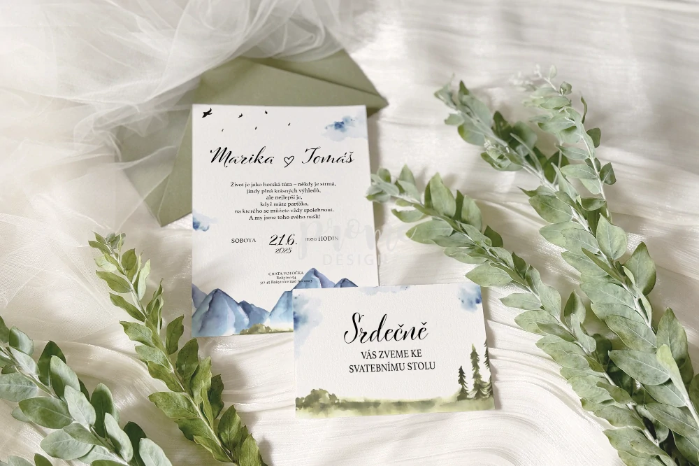 Dodejte své svatbě jednotný a elegantní styl s pozvánkami ke svatebnímu stolu v krásném horském designu. Tyto kartičky jsou ideálním doplňkem ke svatebnímu oznámení, ale můžete si je objednat i samostatně.