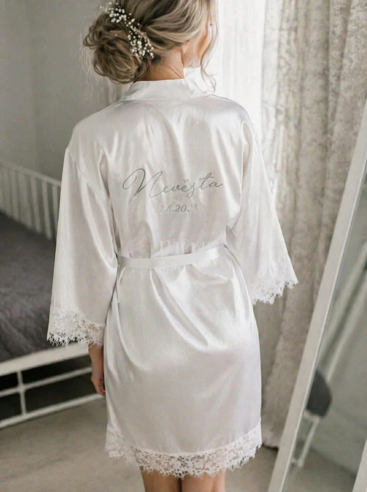 Dámský svatební župan v elegantním odstínu bílé barvy s krajkou - S vlastním textem